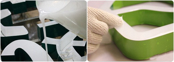 將裝上LED模組的PVC板放進制作好的字殼內(nèi),然后放上透明亞克力隔板用玻璃膠水固定好,拿到溫控室進行平整擺放,然后用調(diào)配好的樹脂膠水倒入平整擺放的字槽中。完成樹脂澆注。